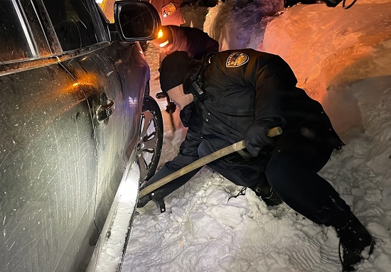 在到達(dá)現(xiàn)場后,救援民警立即為早已凍得瑟瑟發(fā)抖的被困人員送上了熱水和防寒大衣,并安撫了被困人員情緒。在勘察了現(xiàn)場的情況后,救援民警一邊用鐵鍬和雙手迅速清理車輛底盤的厚冰,一邊用牽引繩嘗試將被困車輛進(jìn)行拉出,因積雪太厚嘗試多次未能成功,隨后,協(xié)調(diào)到朗縣養(yǎng)護(hù)段一輛推土機(jī),經(jīng)過一個(gè)小時(shí)救援,被困車輛成功被拖出。被困人員救出來后,為了確保車輛人員的絕對(duì)安全,金東邊境派出所救援民警全力護(hù)送被困人員于晚上11點(diǎn)45分安全抵達(dá)單位營區(qū),救援工作取得圓滿成功。