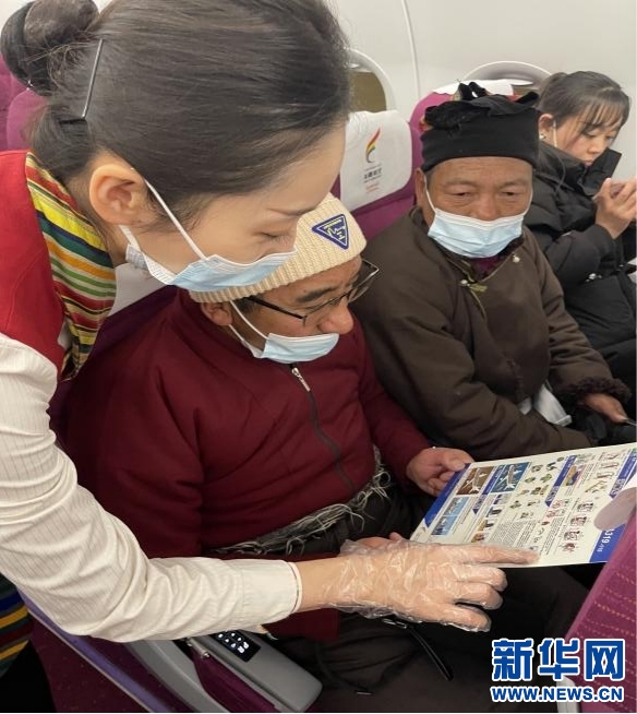 圖為客艙乘務(wù)員為藏族首乘旅客介紹帶有藏語的安全須知卡。(受訪者提供)