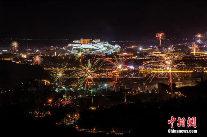 2021年2月10日晚,藏歷新年辭舊迎新“古突”夜,拉薩夜空煙花璀璨。當(dāng)日是藏歷12月29日,自此,藏族民眾一年中最隆重的節(jié)日——藏歷新年的一系列活動(dòng)正式拉開序幕。中新社記者 何蓬磊 攝