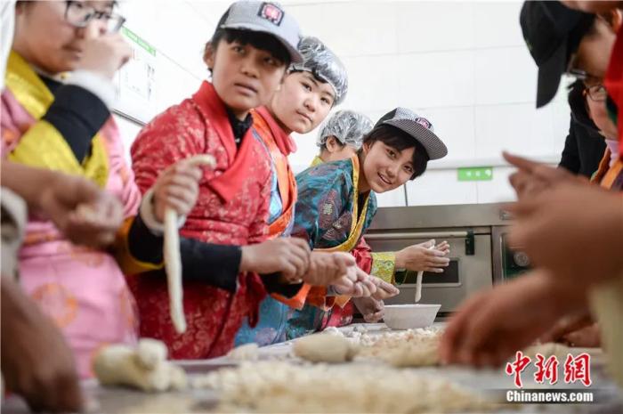 2017年2月25日,幾名藏族學(xué)生在制作“古突”。當(dāng)日,安徽省合肥市第三十五中學(xué)西藏班的藏族學(xué)生通過制作“古突”、表演文藝節(jié)目等方式,迎接藏歷火雞新年的到來。中新社記者 張婭子 攝