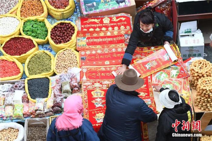 2021年2月,西藏拉薩,藏歷新年來臨之際,民眾選購藏式春聯(lián)。中新社記者 貢嘎來松 攝