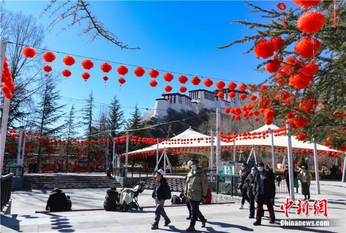 2022年1月29日,拉薩宗角祿康公園內(nèi),大紅燈籠高高掛起。隨著新春佳節(jié)和藏歷新年的臨近,古城拉薩大街小巷張燈結(jié)彩,洋溢著喜慶的節(jié)日氛圍。中新社記者 貢嘎來松 攝