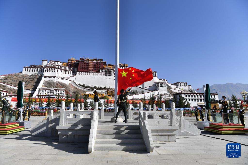 上午10時(shí),隨著《義勇軍進(jìn)行曲》的響起,五星紅旗在布達(dá)拉宮廣場(chǎng)迎風(fēng)飄揚(yáng)。大家肅穆而立,向著國(guó)旗行注目禮。
