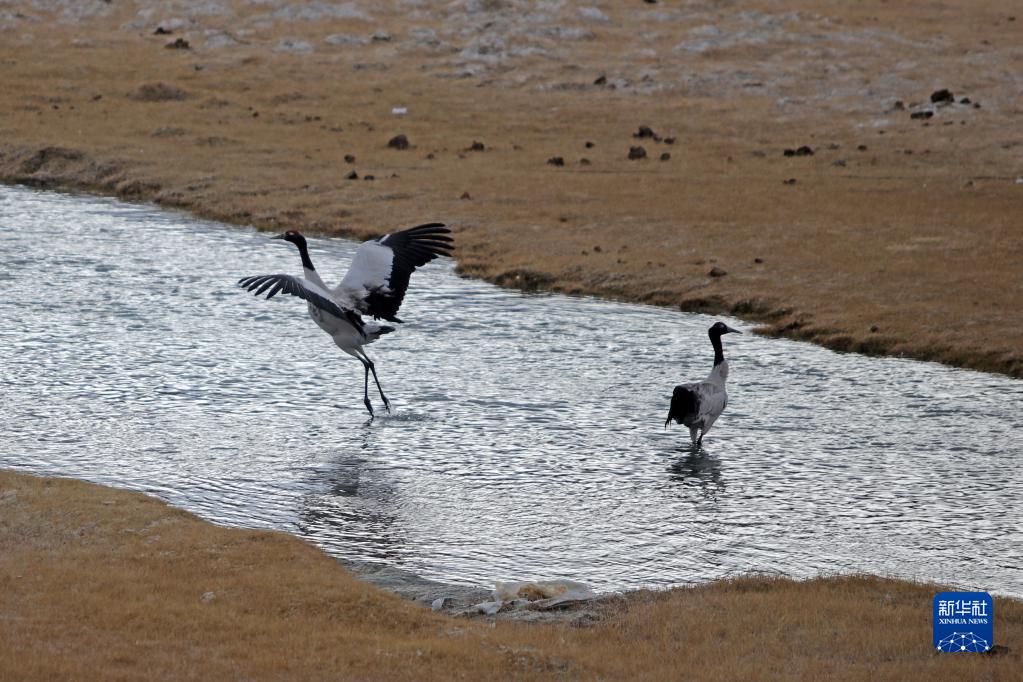 這是在西藏日土縣拍攝的一對黑頸鶴(4月9日攝)。新華社記者 姜帆 攝