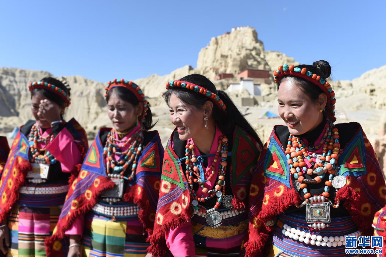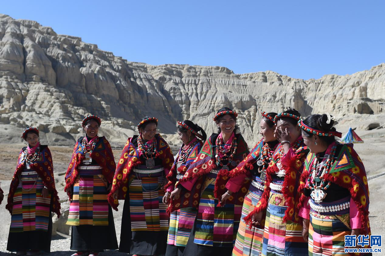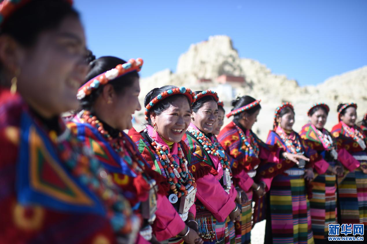 4月23日,當?shù)厝罕娫诠鸥裢醭z址腳下準備表演宣舞。新華網(wǎng) 旦增努布攝