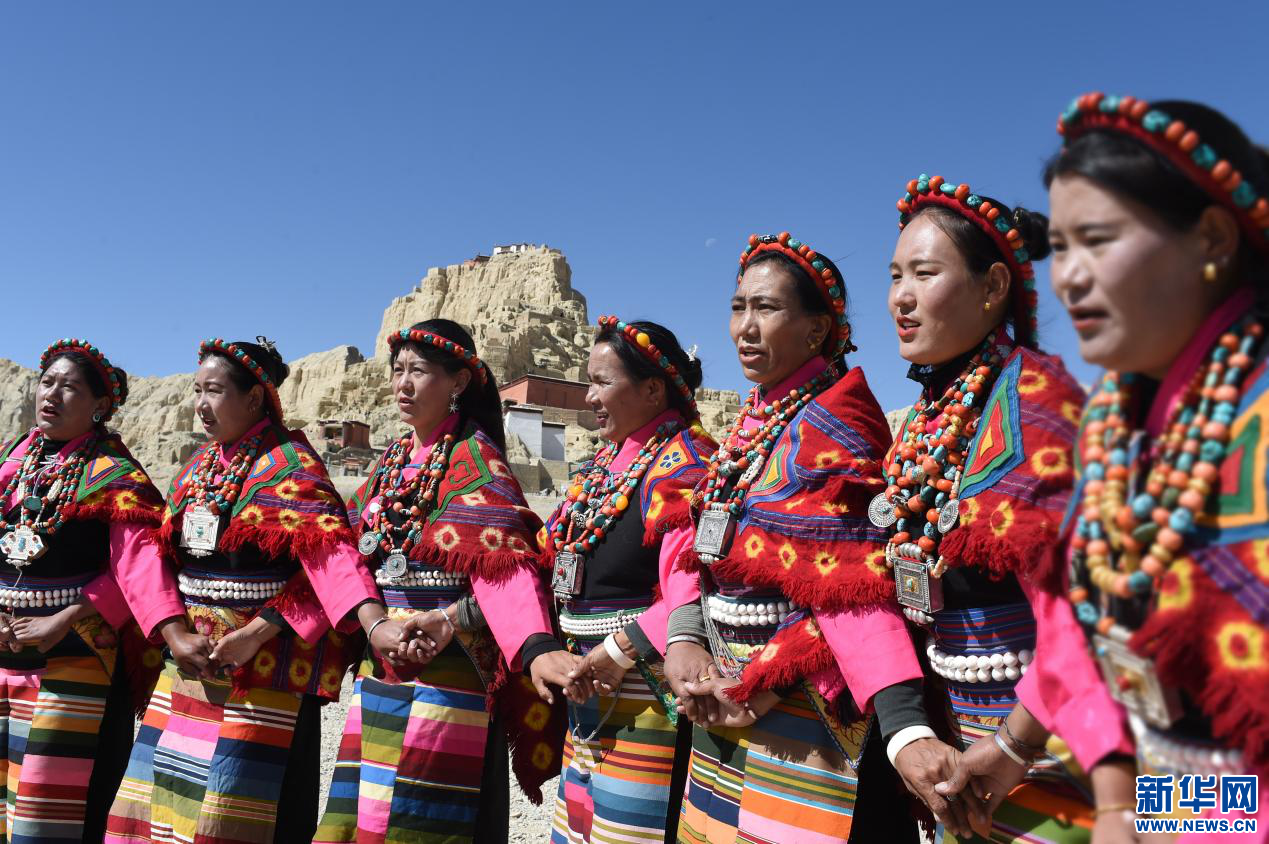 4月23日,當?shù)厝罕娫诠鸥裢醭z址腳下表演宣舞。新華網(wǎng) 旦增努布攝
