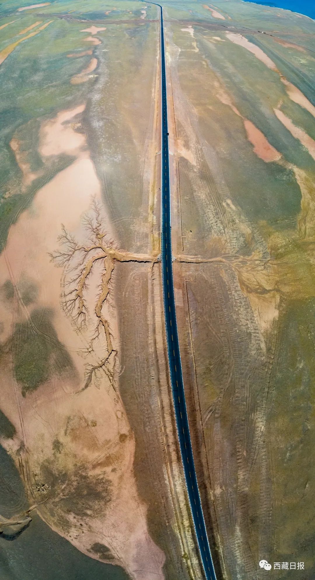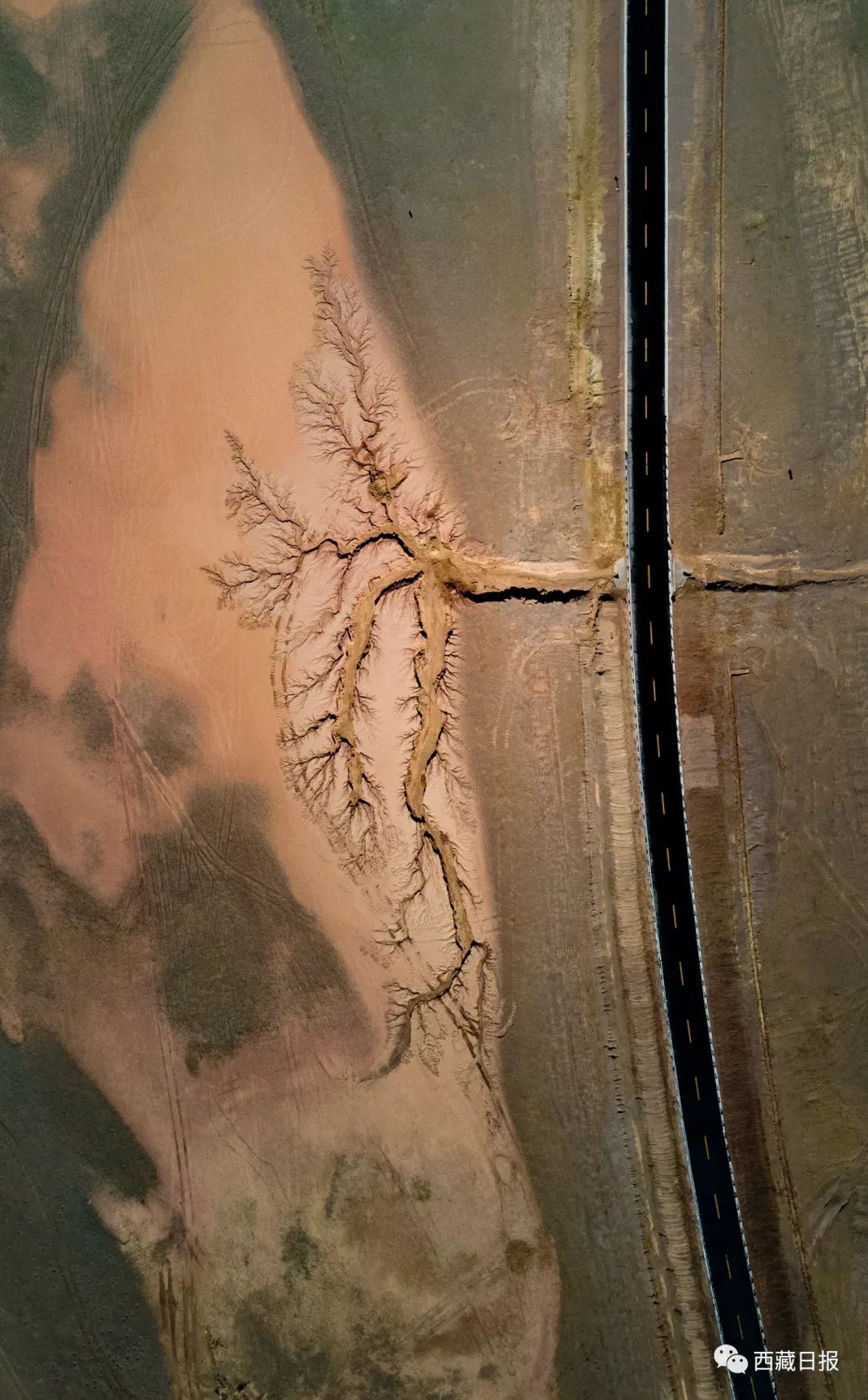 位置:“大地之樹”位于達(dá)則措南,距離尼瑪縣城30公里處,國(guó)道317 (2442)里程石墩旁邊。這棵大地之樹的樹干在國(guó)道南側(cè),樹根在國(guó)道北側(cè)。