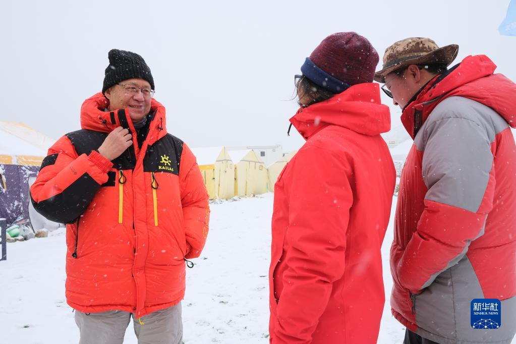 朱彤院士(右一)率領(lǐng)隊伍在絨布冰川附近進行拉練。(2022年5月1日攝)新華社記者姜帆 攝
