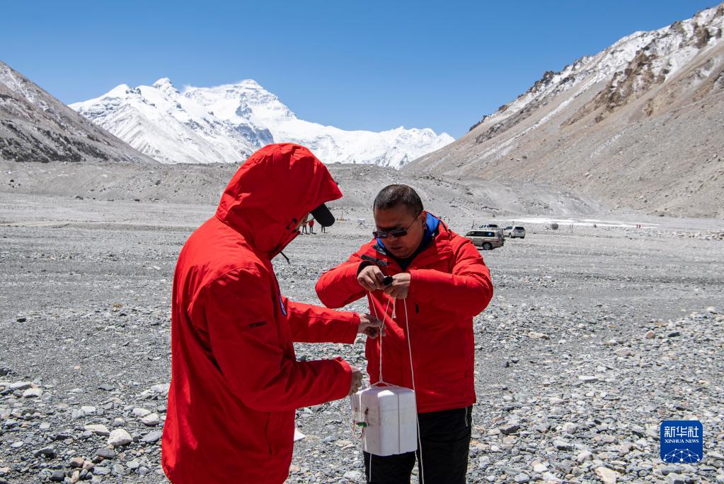 在珠峰登山大本營,科研人員在準(zhǔn)備掛載在探空氣球上的常規(guī)氣象探空儀和臭氧探空儀(5月3日攝)。新華社記者 孫非 攝