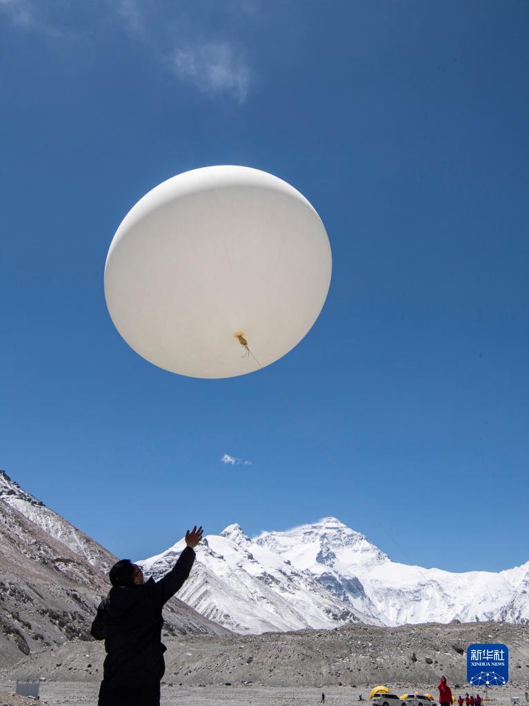 在珠峰登山大本營,科研人員施放大氣臭氧探空氣球(5月3日攝)。新華社記者 孫非 攝