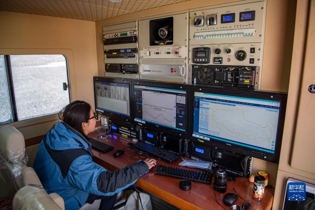 在珠峰登山大本營的氣象應(yīng)急保障車內(nèi),西藏自治區(qū)氣象局工作人員在查看實(shí)時氣象數(shù)據(jù)(5月3日攝)。新華社記者 孫非 攝
