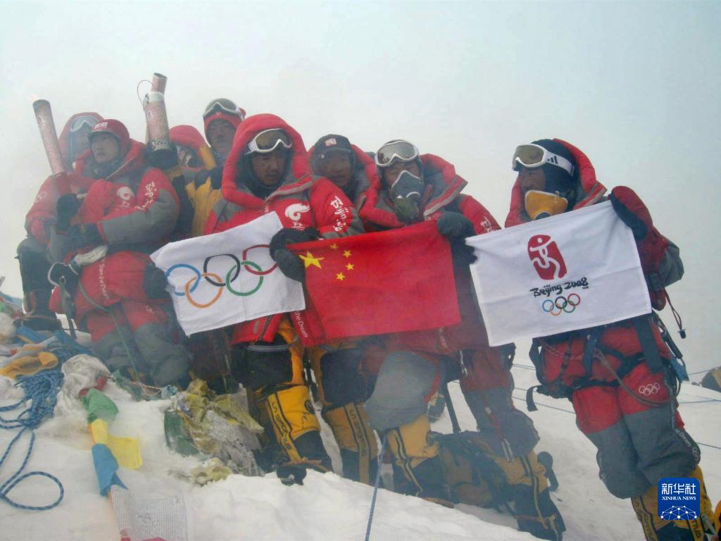 2008年5月8日,北京奧運(yùn)圣火珠峰傳遞登山隊(duì)成功登頂珠峰,德慶歐珠(右五)與隊(duì)友在峰頂展示中國(guó)國(guó)旗、奧運(yùn)五環(huán)旗和北京奧運(yùn)會(huì)會(huì)徽旗。