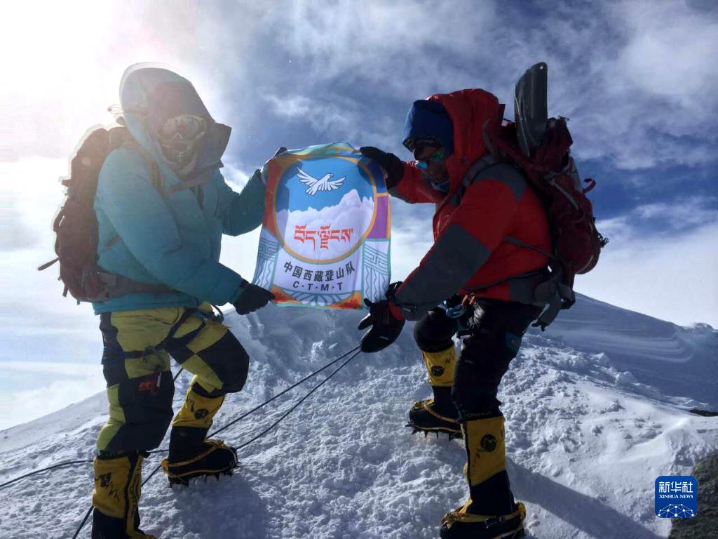 在珠穆朗瑪峰峰頂,科考隊(duì)員展示第二次青藏高原綜合科學(xué)考察研究旗幟。