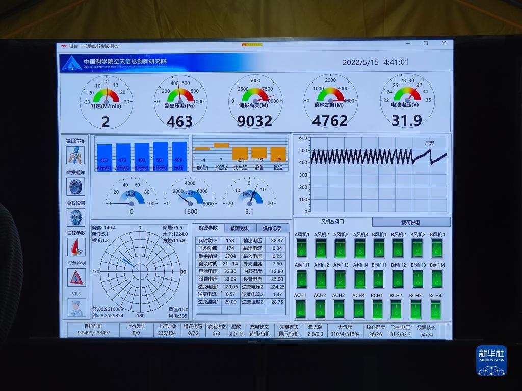 中國科學(xué)院空天信息創(chuàng)新研究院“極目一號”Ⅲ型浮空艇地面控制軟件顯示,浮空艇達(dá)到海拔9032米(5月15日 攝)。新華社記者 田金文 攝
