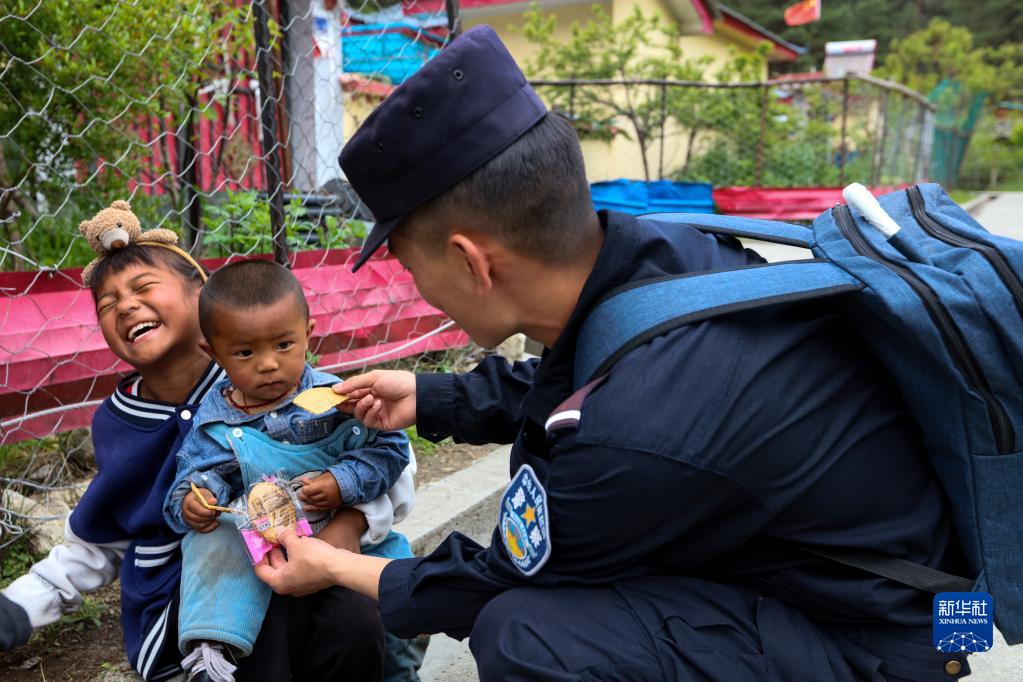 上察隅邊境派出所“背包民警”在走訪(fǎng)中給路邊的小朋友送零食(受訪(fǎng)者供圖)。