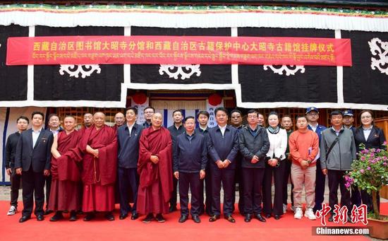 5月26日,西藏自治區(qū)圖書館大昭寺分館和自治區(qū)古籍保護(hù)中心大昭寺古籍館正式揭牌。這是繼拉薩哲蚌寺之后,又一座寺廟建立分館。圖為揭牌儀式現(xiàn)場。 中新社記者 貢嘎來松 攝