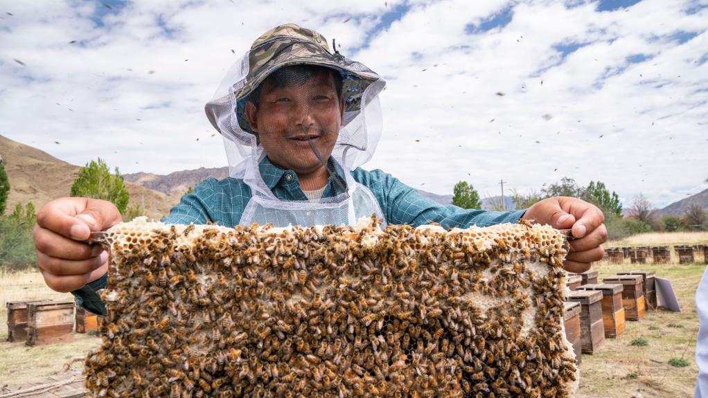 山南市錯那縣覺拉鄉(xiāng)村民普巴占堆正在查看蜜蜂情況。新華社記者 孫非 攝