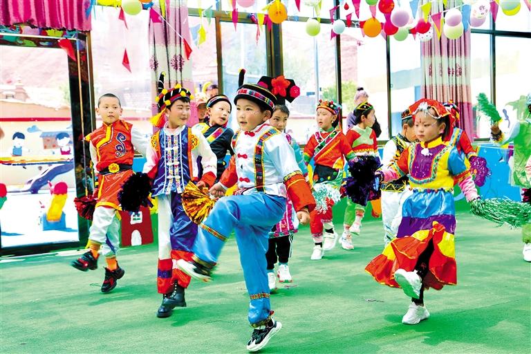 山南市瓊結(jié)縣下水村雙語幼兒園的孩子們在表演民族團(tuán)結(jié)進(jìn)步舞蹈《愛我中華》。通訊員 倫珠澤仁 記者 次旺 攝