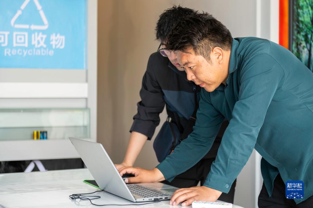 “格?;ㄩ_”大學(xué)生就業(yè)創(chuàng)業(yè)特訓(xùn)營學(xué)員、西藏藏建科技股份有限公司職員次仁瓊達(dá)(左)在工作(2022年6月24日攝)。新華社記者 姜帆 攝
