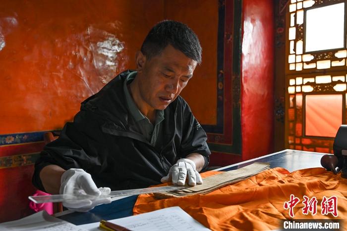 圖為6月27日,拉薩,西藏自治區(qū)藏醫(yī)院文獻研究所相關(guān)負責(zé)人次旦平措對交接而來的古籍檢查測量尺寸。 中新社記者 趙朗 攝