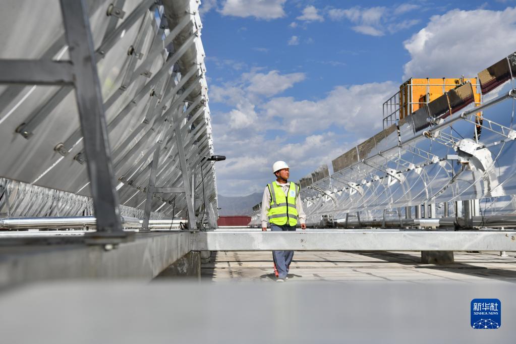 中建一局工作人員檢查高散輻射主動式太陽能供暖設(shè)備(7月6日攝)。新華社記者 晉美多吉 攝