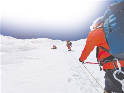 但還是碰上了意外。從8300米再往上走,積雪有五六十厘米深,沿路安全繩都被雪埋了。安全繩是登頂?shù)纳K,大家必須把繩子拽出來(lái),抖掉冰,再一點(diǎn)點(diǎn)前進(jìn)。到達(dá)海拔8800米處,比原計(jì)劃晚了三個(gè)小時(shí)。