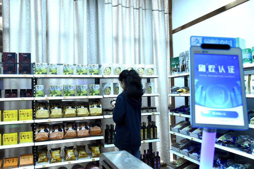 參觀者在體驗無人超市。(新華社發(fā) 旦增努布 攝)
