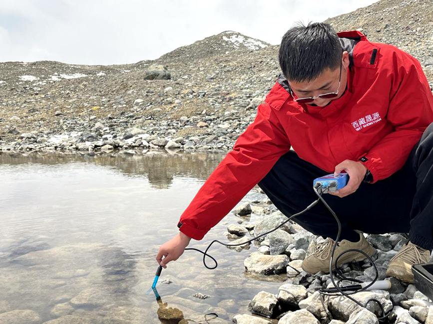 2022年5月10日,那曲市開(kāi)展“江河源”生態(tài)保護(hù)工作,科研人員對(duì)長(zhǎng)江源水質(zhì)進(jìn)行檢測(cè)。王豐收 攝