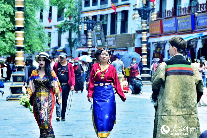 2022年5月,西藏迎來(lái)旅游旺季,游客身著藏裝在八廓街拍照留念。人民網(wǎng) 李海霞 攝