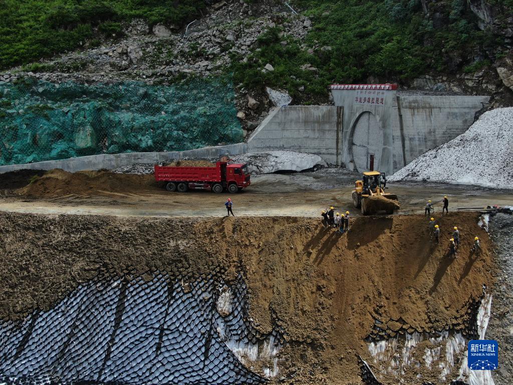 工人在派墨公路多雄拉隧道出口段土工格室高寒邊坡綠化實驗項目現(xiàn)場施工(2020年8月18日攝,無人機(jī)照片)。新華社發(fā)(董志雄 攝)