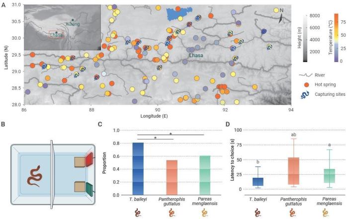 中國科研人員結(jié)合野外調(diào)查和文獻調(diào)研,整理了高原地熱資源以及溫泉蛇的分布信息,發(fā)現(xiàn)溫泉蛇高度偏好溫泉生境。通過趨熱行為學(xué)實驗證明,相較于另外兩種低海拔蛇類,溫泉蛇能夠更快速地定位到高溫區(qū)域,且對高溫區(qū)表現(xiàn)出強烈的偏好,提示溫泉蛇具有高效的溫度感知能力。