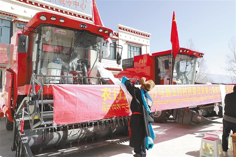 農(nóng)行拉薩分行向該行駐村點(diǎn)尼木縣聶玉村捐贈(zèng)大型收割機(jī)。