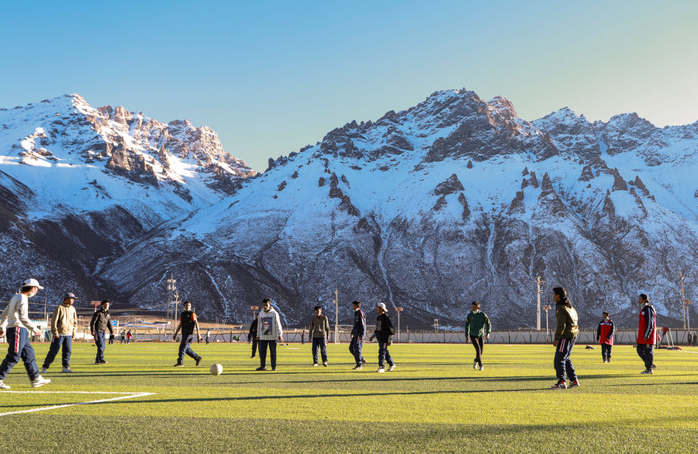 西藏當(dāng)雄縣中學(xué)的學(xué)生們在踢足球(1月5日攝)。新華社發(fā)(索朗珠扎 攝)