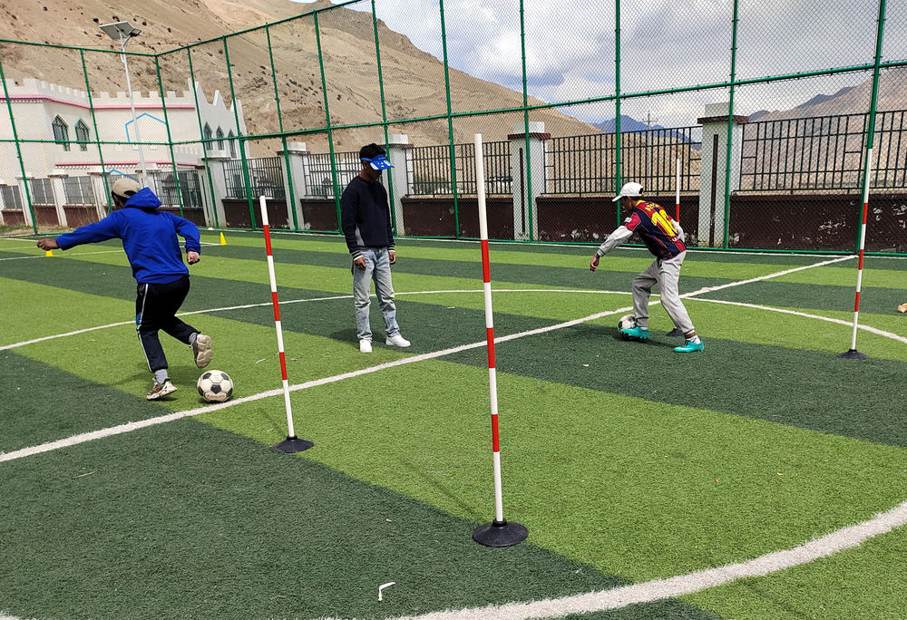 在西藏日喀則市定日縣扎西宗鄉(xiāng)完全小學(xué)的球場上,足球興趣小組的教練普次(中)在指導(dǎo)學(xué)生帶球繞桿(4月21日攝)。新華社發(fā)(白瑪 攝)