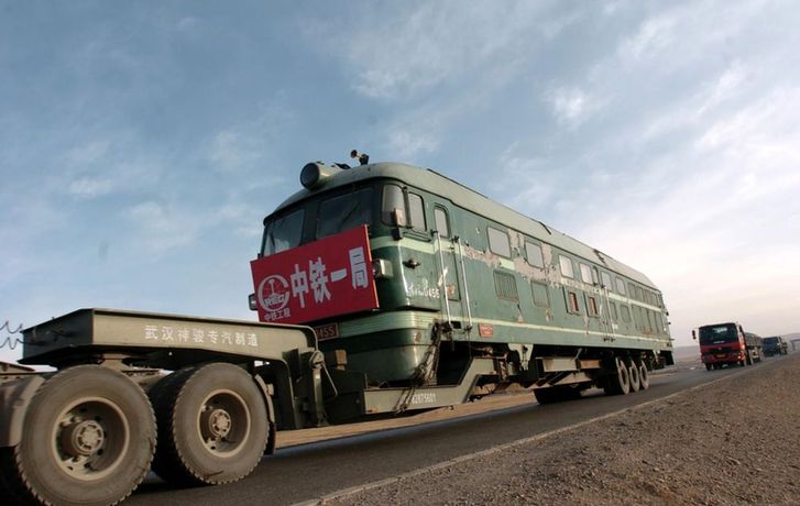 2005年4月19日,一輛汽車上裝著一輛機(jī)車,從青海省格爾木市秀水河車站經(jīng)過(guò)青藏公路向西藏安多方向行駛。青藏鐵路建設(shè)總指揮部從2004年3月開始陸續(xù)把近200臺(tái)機(jī)車、鋪軌機(jī)、架橋機(jī)、軌道車等大型鋪架設(shè)備用汽車從格爾木安全運(yùn)抵西藏安多,途中翻越海拔5231米的唐古拉山埡口,創(chuàng)造了鐵路建設(shè)史上的奇跡。