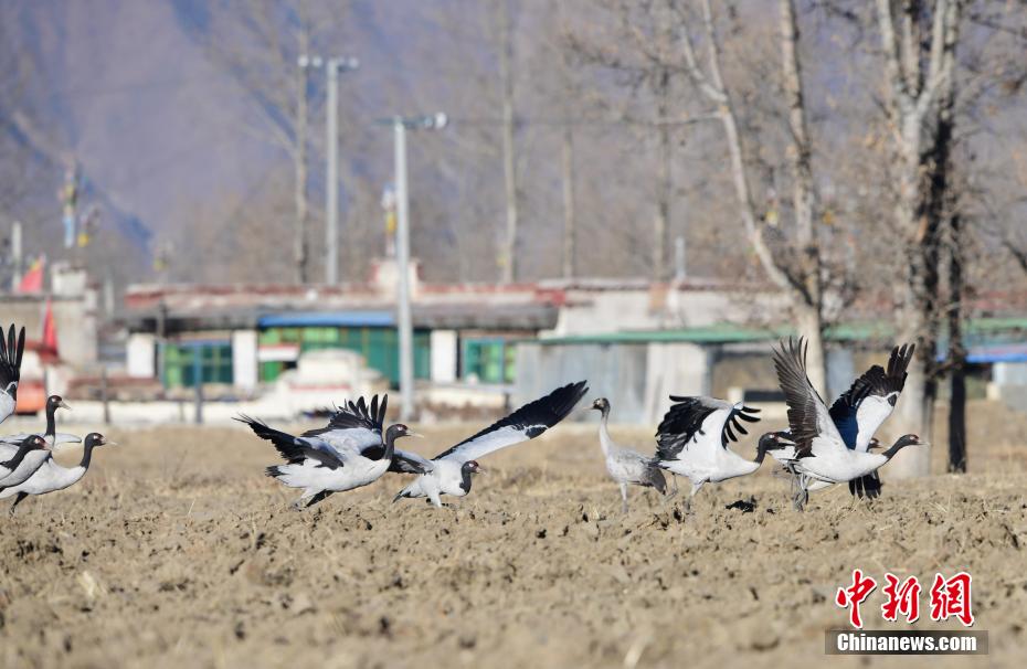 每年的10月底,成群的黑頸鶴飛到西藏拉薩市林周縣越冬,在拉薩市林周縣周邊的湖泊濕地度過5個月的“閑云野鶴”生活,次年三四月份再飛向藏北草原繁殖。黑頸鶴是世界上唯一一種高原鶴類。具有足長、喙長、頸長的典型涉禽類特征,適合在沼澤地里行走。黑頸鶴的頸、尾為黑色,體羽為灰白色。黑頸鶴是國家一級保護(hù)動物。目前,每年到林周縣越冬的黑頸鶴已達(dá)2000只左右。圖為黑頸鶴在林周境內(nèi)的農(nóng)田里覓食、嬉戲。 貢嘎來松 攝