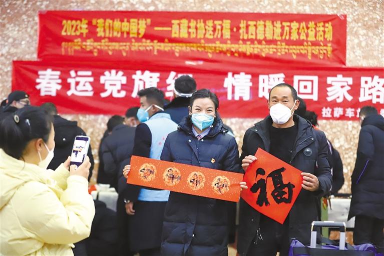 7日,拉薩火車站“天路格?;ā秉h員突擊隊開展兔年大吉心愿墻、新春猜謎送祝福等活動,提升鐵路運輸服務(wù)品質(zhì),讓旅客安心、順心出行。圖為拉薩火車站的工作人員將“?!弊炙徒o旅客。記者 楊小娟 旦增蘭澤 攝