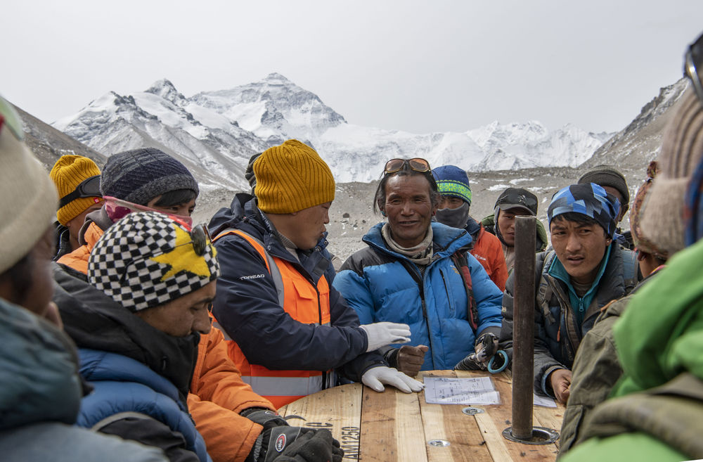 格桑(中間穿藍(lán)色羽絨服者)和其他村民一起商議將光纖運(yùn)送到海拔6500米前進(jìn)營(yíng)地的方法(2020年4月15日攝)。2020珠峰高程測(cè)量期間,為保障峰頂信號(hào)質(zhì)量,網(wǎng)絡(luò)運(yùn)營(yíng)商需要將光纖鋪設(shè)至海拔6500米的珠峰前進(jìn)營(yíng)地。格桑和其他村民一起,承擔(dān)起運(yùn)輸光纖的任務(wù)。