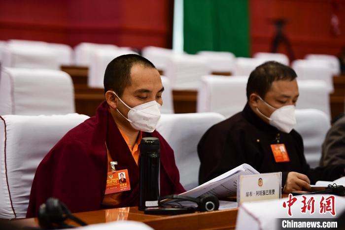 1月12日,政協(xié)第十二屆西藏自治區(qū)委員會(huì)第一次會(huì)議在拉薩開(kāi)幕,西藏政協(xié)宗教界委員瓊布·阿旺強(qiáng)巴堅(jiān)贊活佛(左)出席開(kāi)幕會(huì)。 中新社記者 貢嘎來(lái)松 攝