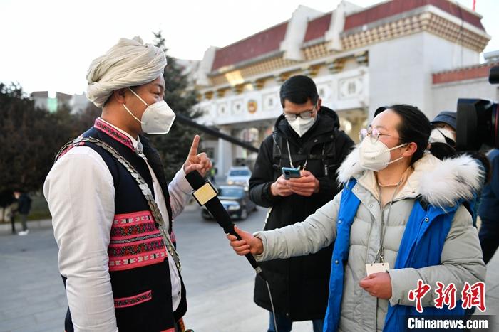 1月12日,政協(xié)第十二屆西藏自治區(qū)委員會(huì)第一次會(huì)議在拉薩開(kāi)幕,西藏政協(xié)文化藝術(shù)節(jié)界委員迪龍(左)接受媒體的采訪。 中新社記者 貢嘎來(lái)松 攝