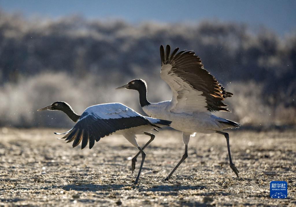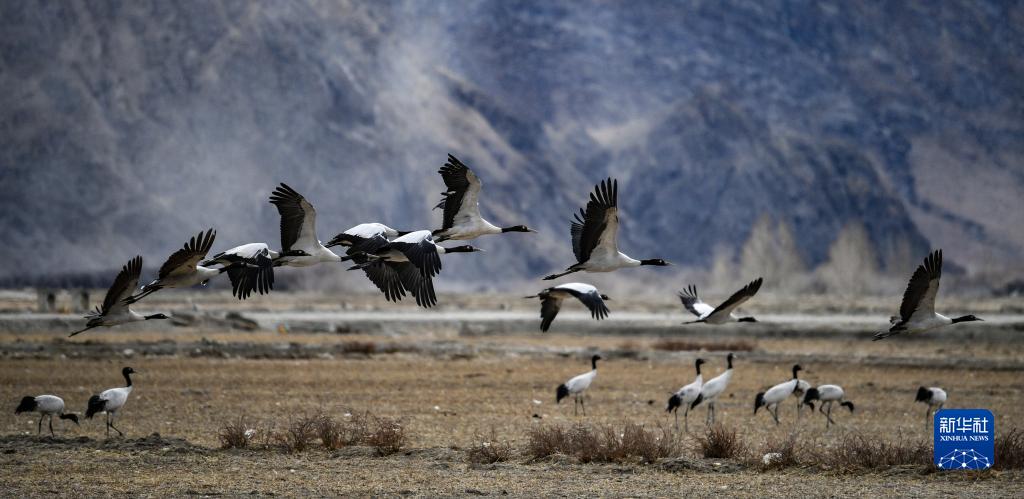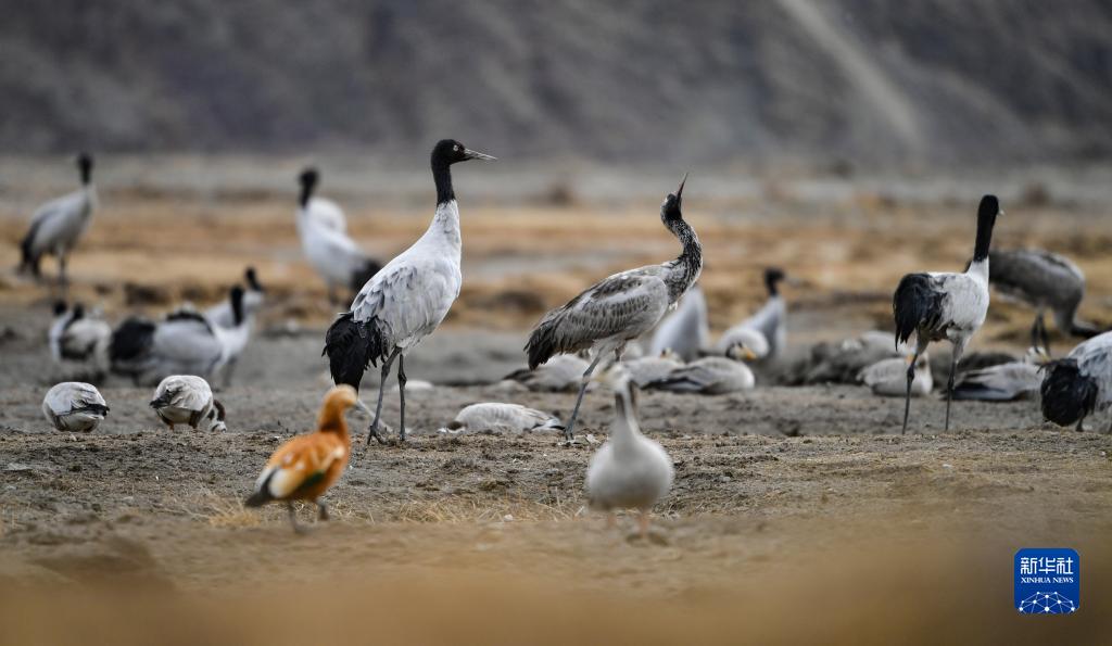 在西藏雅魯藏布江中游河谷黑頸鶴國(guó)家級(jí)自然保護(hù)區(qū)日喀則片區(qū)拉孜縣附近,大量越冬的黑頸鶴翩翩起舞,迎接春天的到來。