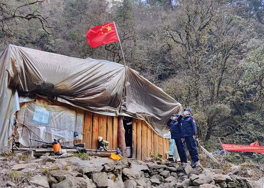 圖為春節(jié)前夕,拉郊邊境派出所移民管理警察王彥凱(左一)與同事為執(zhí)勤點(diǎn)更換新國旗后,向國旗敬禮。伊比熱恨攝