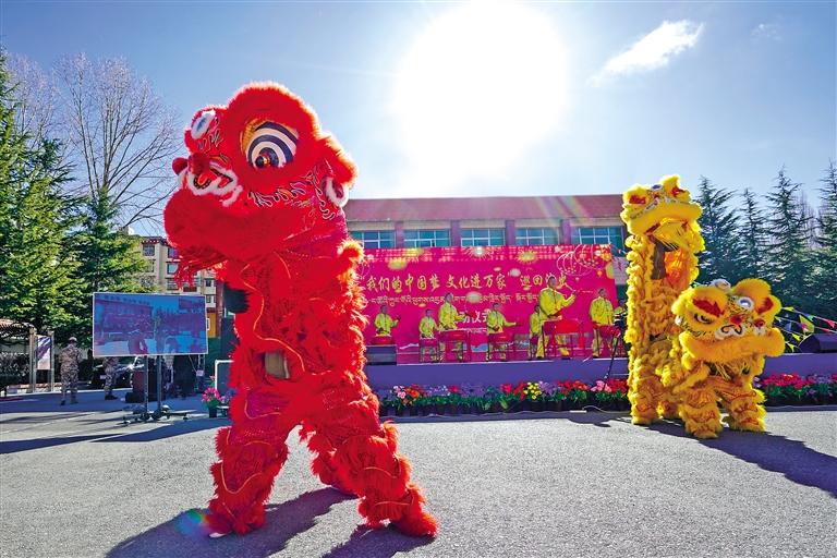 武警西藏總隊(duì)拉薩支隊(duì)官兵表演舞獅。 通訊員 張啟 記者 格桑倫珠 攝