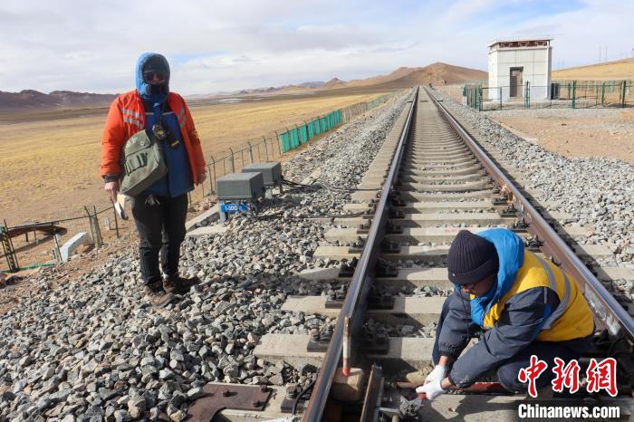 冬季西藏那曲寒風(fēng)凜冽,工長楊建青(右)加固道岔安裝螺絲。 馬生明 攝