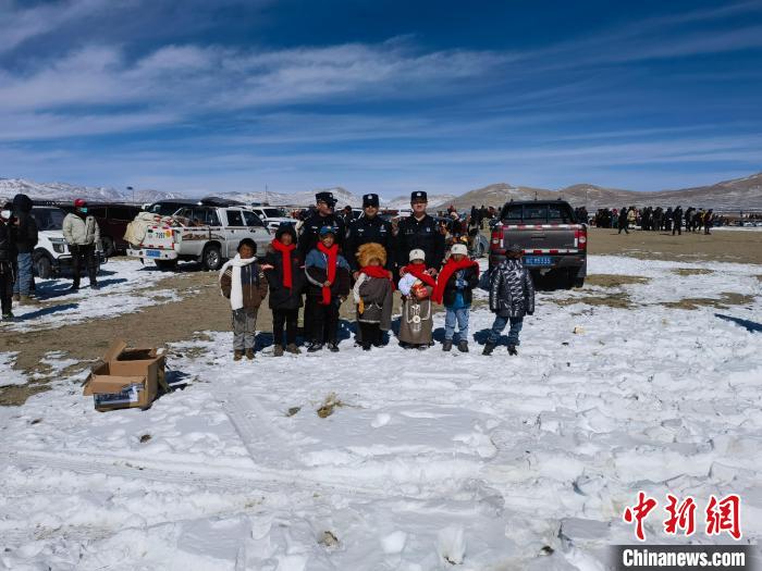 圖為民警將圍巾分發(fā)給轄區(qū)小朋友?!』魻柊瓦吘撑沙鏊?攝