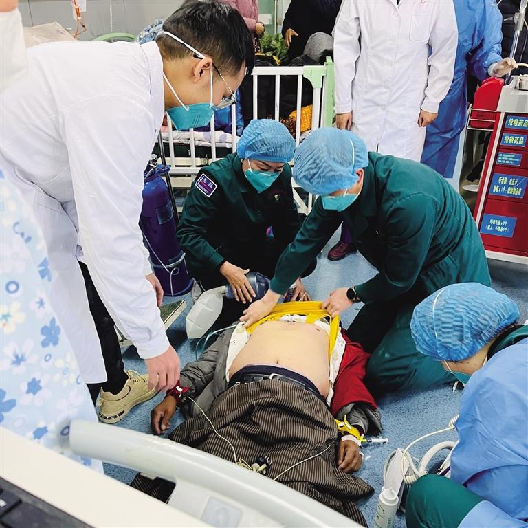 急診科值班醫(yī)生陳勝、副護士長趙文熠等立即攜搶救車、除顫儀趕赴現(xiàn)場,此時,冬某意識喪失、頸動脈搏動消失、呼吸極其微弱。見患者病情危及生命,醫(yī)護人員立即實施搶救工作。急診醫(yī)護團隊配合默契,胸外心臟按壓、球囊輔助通氣、建立靜脈通道、靜推腎上腺素、查心電圖、監(jiān)測生命體征、吸痰……一切有條不紊地進行著。隨后,心電圖提示室顫,醫(yī)護人員立即予以非同步200J電除顫1次,待轉(zhuǎn)運床到位后立即轉(zhuǎn)運患者至搶救室進一步救治,轉(zhuǎn)運過程中心肺復蘇不間斷。