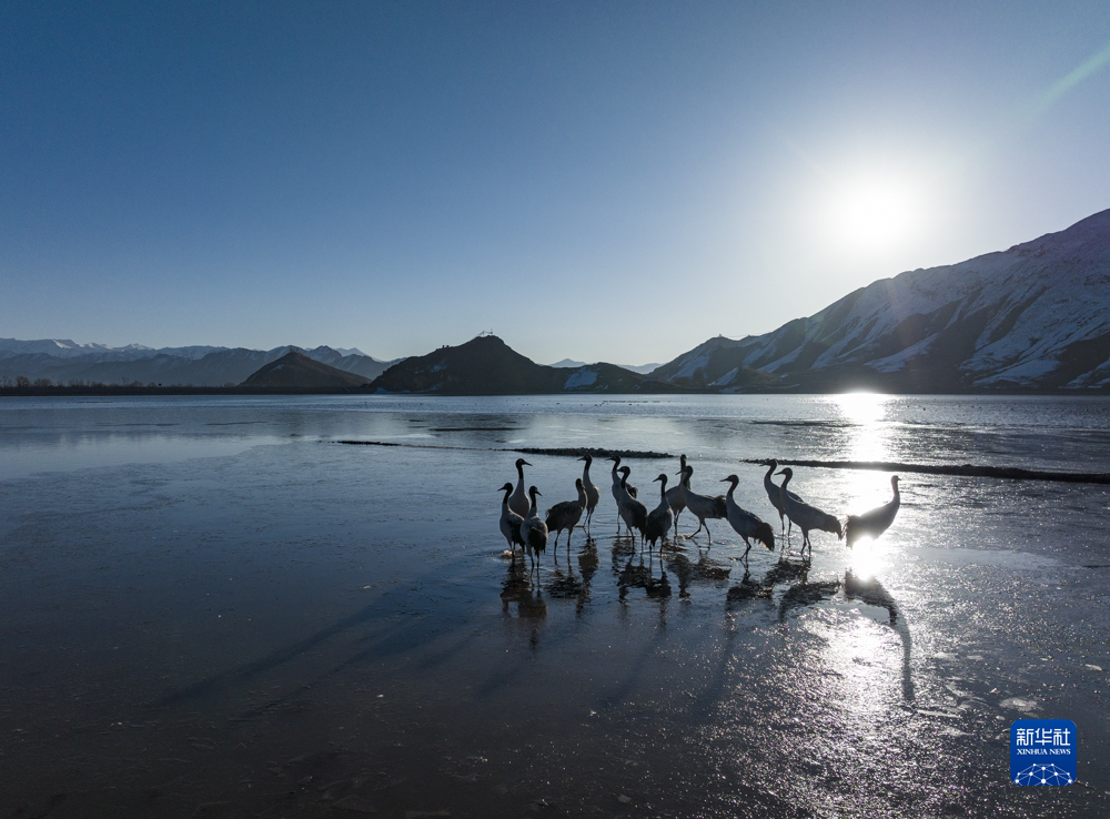 這是在拉薩市林周縣卡孜水庫(kù)拍攝的黑頸鶴(3月1日攝,無(wú)人機(jī)照片)。新華社記者 孫非 攝