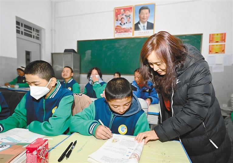 西格辦中學(xué)女教師給學(xué)生輔導(dǎo)功課。 王敏 攝