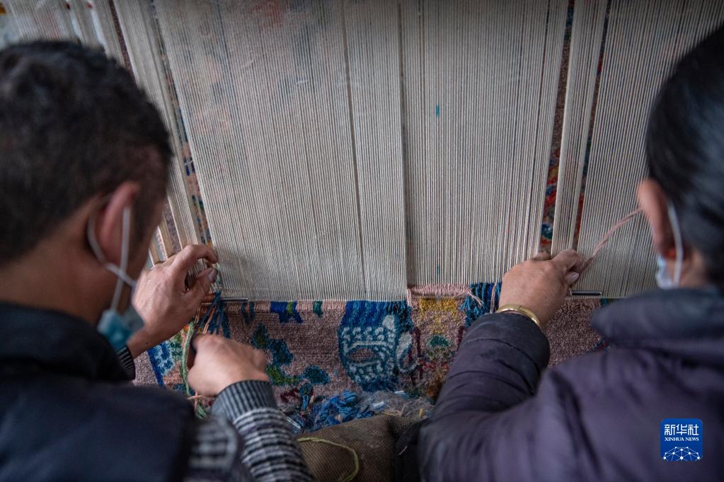 在江孜縣地毯廠,工人對卡墊進行修剪(3月19日攝)。新華社記者 孫非 攝