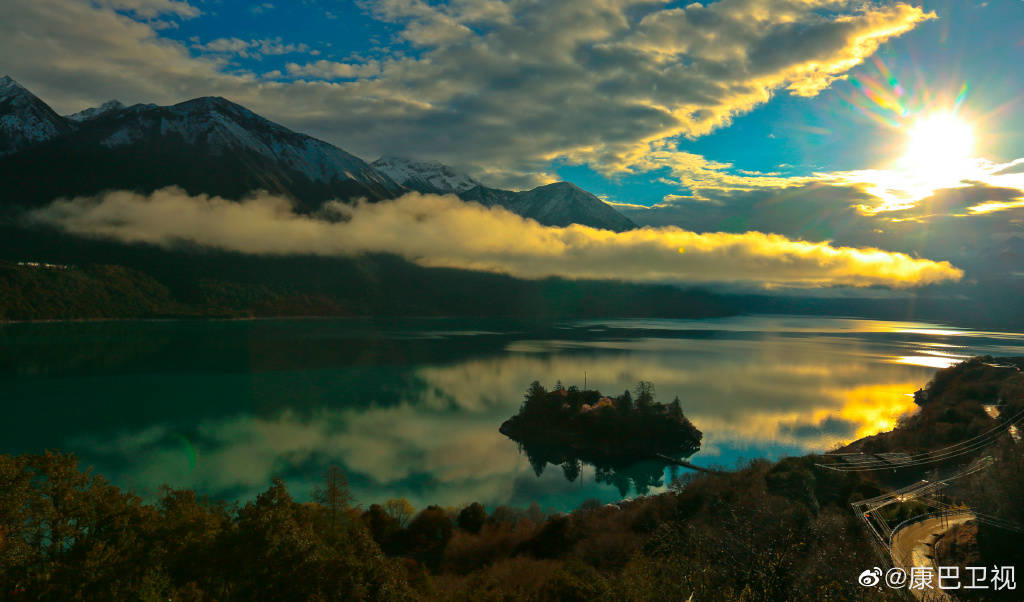 湖邊房舍錯(cuò)落,一湖如帶,濕地從湖邊村緩緩延展至湖畔,而海拔6300多米的杰青那拉嘎布雪山,照映在湖面,飄渺的云霧如從天上飄下……宛如一座世外桃源小仙境。